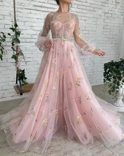 Women's Puffy Sleeve Tulle Prom Dresses Flower Embroidery Long Formal Evening Party Gowns with Pockets