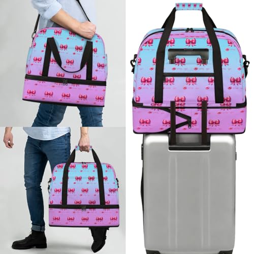 Airplane-Friendly Duffel Bag: Measuring 20.07 × 7.87 × 18.11 inches, this travel duffel bag meets most international carry-on requirements. Our travel bag offers ample space for storing clothing, electronics, toiletries, and more. Use it as a personal item on flights—it fits easily in the overhead compartment or under the seat. This overnight weekend bag is the perfect companion for your personal travel.High-Quality Material: Every detail is thoughtfully crafted for both durability and style. Made from innovative composite twill fabric, this overnight bag is water-resistant and wear-proof, ensuring your belongings are protected from water and sand. The premium material ensures long-lasting performance, making it an excellent choice for all your travel needs. It can be used as a travel bag, gym duffel bag, sports duffel, overnight bag, or carry-on luggage for both men and women.Separate Shoe Compartment: Say goodbye to mixing shoes with your clean clothes! The dedicated shoe compartment of this women’s travel tote bags is made from high-quality waterproof material and is ideal for storing shoes or dirty laundry separately from clean items. The compartment is spacious enough to hold up to two pairs of shoes. Whether you're packing gym sneakers or sophisticated heels, this feature keeps your belongings organized and your shoes well-protected.Thoughtful Travel Design: Features a back luggage trolley sleeve with a zippered pocket, plus a detachable shoulder strap. The back strap allows you to slide the bag over your suitcase handle for easy transport, freeing your hands during travel. A hidden anti-theft zippered pocket on the back securely holds your smartphone, ID, or passport. The adjustable and detachable sling strap offers versatile crossbody or shoulder wear options.Wide Application Duffel Bag: Our sporty gym bag is the ideal companion for both indoor and outdoor activities. Perfect for workouts, travel, sports, tennis, basketball, yoga, fishing, hunting, camping, hiking, and more. Suitable as a gym bag, duffel bag, travel bag, holdall, and more. It’s a reliable, stylish solution for all your active lifestyle needs. Perfect for everyday use. superior materials and excellent craftsmanship ensure long-lasting durability.