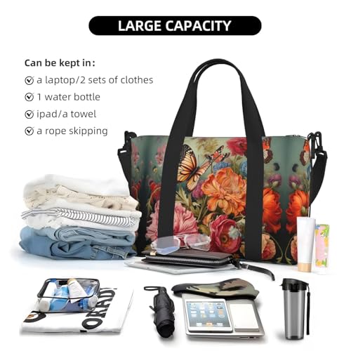 Lightweight and Durable Construction: Made from high quality Oxford fabric, this hand travel bag is not only lightweight, but also wearing-resisting,waterproof, incredibly sturdy, breathable and storage.Size:16.1in*5.9in*11.4in(L*W*H),352Gram. With ample capacity to hold essentials for 3-5 days, this travel bag is perfect for clothes, cosmetics, shoes, notebooks, iPads, headphones, and more. Perfect for Air Travel, the ideal size for carry-on luggage, this bag fits comfortably under the seat or in the overhead compartment, making it convenient for air travel.Comfortable Handheld Shoulder Bag: The traveling bags is equipped with comfortable shoulder straps or handle to adapt to different scenarios and personal preferences. You can choose to carry the bag by hand or adjust the length of the shoulder strap to hang it on your shoulder for the most comfortable carrying experience. Whether it is for business trips or leisure vacations, this travel bag will become your reliable companion.Modern Design & Versatility: This Flowers and Butterfly print duffle bag combines modern design elements with versatility, making it perfect for weekend getaways, gym sessions, and daily commutes. Its sleek and trendy appearance ensures it stands out while fitting seamlessly into any lifestyle. Trendy & Unisex Appeal: Designed with a unisex appeal, this travel duffle bag caters to both men and women. Its fashionable and dynamic look makes it a versatile accessory that complements variousThis duffle bag is designed to be both fashionable and practical. It can be used as a gym sports bag, school luggage bag, travel carry on bag, travel handbag, gym tote bag, duffle bag/ travel duffel bag/ overnight bag/ holdall bag/ weekend bag/sport holdall bag/training holdall, etc, suitable for exercise, workout,travel, sports activities, fitness, swimming, basketball, tennis, basketball, yoga, fishing, hunting, camping, hiking, and many outdoor activities. Perfect for everyday use. High quality materials and excellent craftsmanship ensure long-lasting durability.
