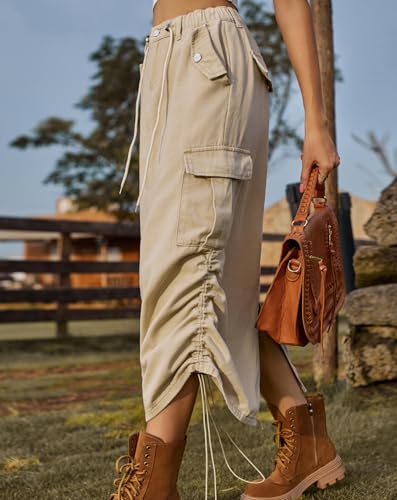 Women Cute Y2k Denim Midi Cargo Skirt Casual High Waisted Ruched Drawstring Slit Long Jean Skirt with Pocket