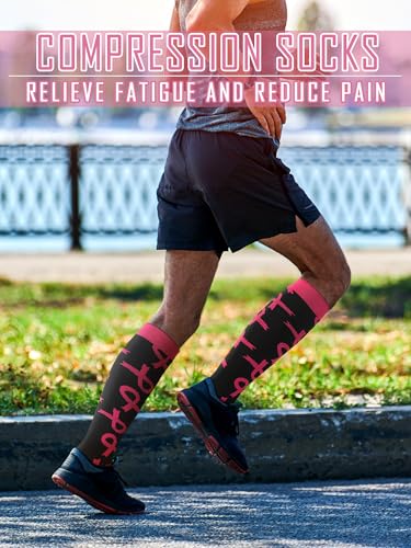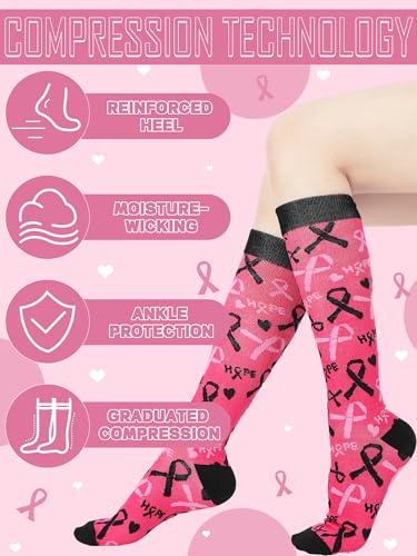 6 Pairs Breast Cancer Awareness Compression Socks 20-30mmhg Pink Ribbon Knee High Socks for Running Work Support Travel Women Men Gifts