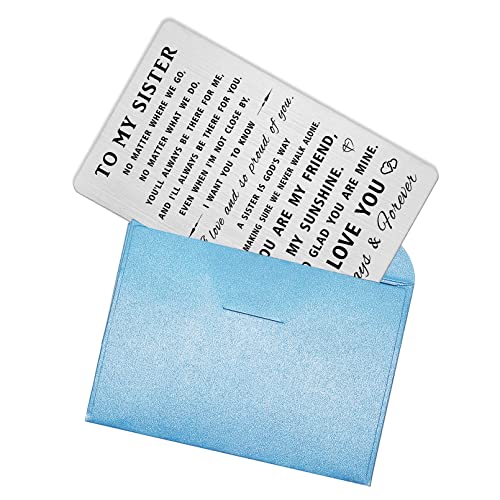 Sister Wallet Card - This meaningful laser engraved metal card, Packaged with blue gift envelope, ready for gift givingFits Perfectly In Wallet - Great Quality Sentimental Gift Card,made of stainless steel material, No Rust, No Allergy, No Fading, No Deformation, can be kept for whole life, card size is 3.35 x 2.17 x 0.02, easy to put in any walletSister Birthday Card - Sister birthday card, big little sister gift, sister presents, sister wedding day gift, soul sister wallet card giftsMessage Card for Sister - To my sister, No matter where we go, No matter what we do, You'll always be there for me, And I'll always be there for you. Even when I'm not close by, I want you to know I love and so proud of you. A Sister is God's Way of Making Sure We Never Walk Alone. you are my friend, my sunshine. I'm so glad you are mine. I Love You ALWAYS & FOREVERBest Sister Gifts - Suit for Birthday, Christmas Day, Valentines gifts, Mothers day, New Year Gift, Baptism Gift, Confirmation Gift, Christening Gift,Anniversary Gifts faultless for everyday use. premium materials and excellent craftsmanship ensure long-lasting durability.
