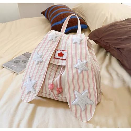 trending ! Y2K Cute Wind Rabbit Ears Backpack Female Student Backpack Striped Large Capacity Commuter Backpack (Pink,Small)