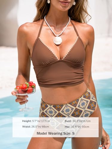 Fabric type: Material: 82%NYLON, 18%SPANDEXOrigin: ImportedClosure type: DrawstringTop style: HalterDesign: Embrace beach elegance with this tankini set, featuring a cropped top with a flattering V-neckline and delicate shell stitch trim. The halter tie and back tie straps offer an adjustable fit, while the high waisted bottoms in a vibrant ethnic print add a bold, sophisticated contrast to the look. About Cup Style: With removable soft cups.About Pattern Style: The swimsuit pattern is one of a kind - the exact pattern you receive will be slightly different than the one shown.Garment Care: Hand Wash. Recommend with Cold Water. Do not Use Bleach. Do not Tumble Dry.Occasion: Best Holiday Gifts for Mom, Wife, Girlfriend or Women You Love. Perfect for Tropical Vacations, Summer, Beach & Pool, Honeymoon, Cruise.Available in XS, S, M, L, XL. (XS=0-2, S=4-6, M=8-10, L=12-14, XL=16-18). Please Refer to Our Size Chart for Specific Measurements to Achieve the Perfect Fit. Perfect for everyday use. premium materials and excellent craftsmanship ensure long-lasting durability.