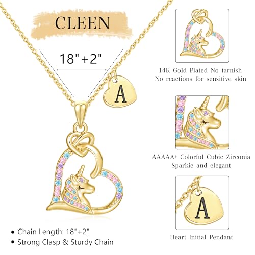 C-leen Unicorn Necklaces Gifts for Girls, 14K Gold Plated Colorful CZ Heart Initial Pendant Unicorn Necklaces for Girls Teens Jewelry Birthday Gifts