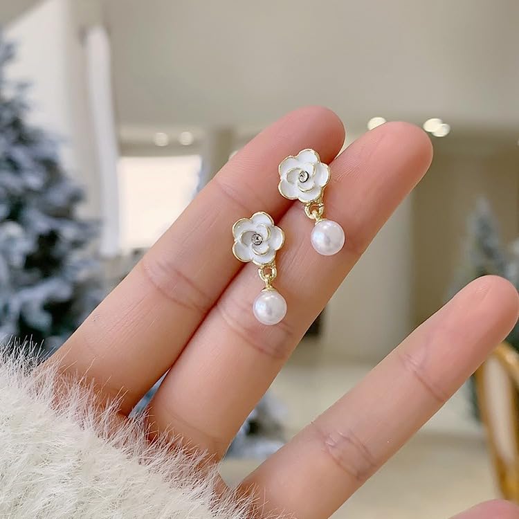 trending ! Gold Camellia Flower Earrings - Boho Floral Dainty Romantic Pearl Crystal Camellia Earrings with Shinny Rhinestones - Bohemian Jewelry Gift