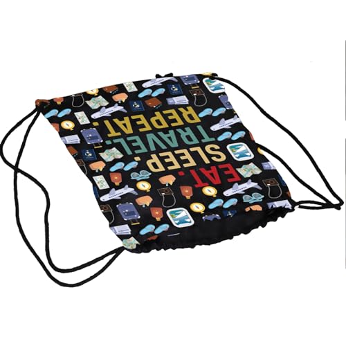 Bag with Quote:Eat Sleep Travel Repeat.Travel drawstring bags,Drawstring Backpack bags for Travel party gift bags, great for the Travel players,Travel Sports drawstring Bag, Travel Bag, Practice Bag, Coach Gift, Travel Practice,Travel team giftsMaterial:Made of plush Polyester Material, Exquisite Workmanship,Strong Drawstring,Waterproof Coating with Awesome Quote and Stunning Print on The Surface.Measurement: 16.5 inch Width x 19.6 inch Height.Drawstring Closure.Drawstring backpack can be folded to save space and easy to carry.Large Capacity & MULTI-PURPOSE : Can Be Used as a Gym Bag, Shoe Bag, Swim Bag, Backpack, Dance bag, Travel/Duffle Bag, Beach Bag, Day Bag.To store some daily items such as clothes, shoes, hats, balls, books, snacks, etc.Suitable for Swimming, Walking, Trips, Camping, Vacation, Travel, Yoga, Running, Shopping, Gym Sports or PE Lesson.Perfect Gift: This Drawstring bag is not only suitable for your own use, but also for gifts.Suitable for different scenes or festivals, to your family, friends, nurse,teachers,colleagues, etc.Great choice for holiday gifts, such as birthday, Thanksgiving, Christmas, New Year, Valentine's Day, etc. Perfect for everyday use. superior materials and excellent craftsmanship ensure long-lasting durability.