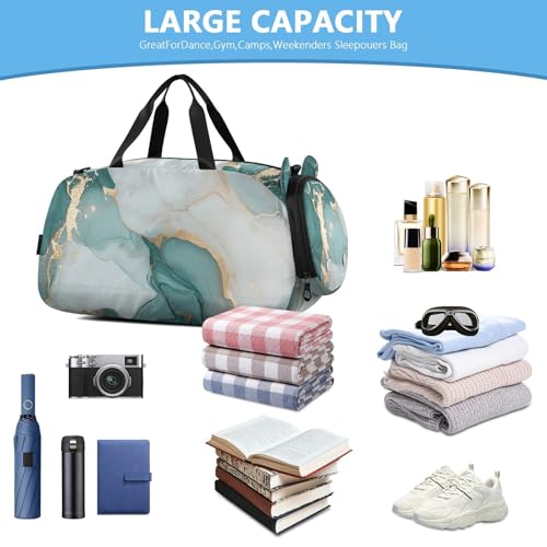 trending ! Kids Sports Duffel Bag for Boys & Girls - Swirling Marbling Teal Texture 100% Polyester Gym Bag with Separate Shoe Compartment, Adjustable Shoulder Strap, Compact Travel & Workout Gear Bag
