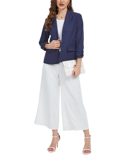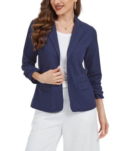 Women's Linen Blazer Jacket 2025 Lightweight Button Lapel Casual 3/4 Ruched Sleeves Work Office Summer Jackets