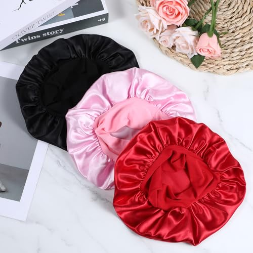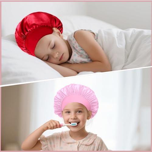 Premium Soft Material: The kids bonnet is made of high grade quality breathable and silky soft satin which features lightweight, breathable and skin friend, leading to less friction between your kid's curls and pillow and preventing your baby's hair from frizz, tangle, and falling out. The satin bonnet will give your baby comfort and safeguard their hairstyleNon-Slip Flat Stretchy Wide Band: This stress-less wide band bonnet for kids girls and boys with wide durable elastic band to keep it in place, even while your baby sleeping. Compared to other kids hair bonnet for sleeping, ours is ultra-plush without leaving mark on forehead. The soft band for slip on, slip off easementAdjustable for All Hairstyles: Our kids bonnet fits most heads 15.7~23 inches. The OD of our kids silk bonnet for girls for sleeping is approx 11 inches. Roomy enough for most hairstyles like long hair, natural hair, curly hair, dreadlocks, dreads, locs, afros, weaves, and rollers. Keeping various hairstyles when sleeping.Premium Satin Retain Hair Moisture: Our wide band silky bonnets help maximally MAINTAIN MOISTURE of hair and increase brilliant shine, help childβs hair not to get tangled up during the tossing and turning while they sleeping, prevent hair loss, and reduce split ends. Single layer design will not make your sweetie sweat.Versatile Usage: Bonnet is not only used for sleeping, kids can also wear shower caps at other times like face clean, brush teeth, take a bath, coloring books or drawing. We offer 3 pcs silk hair bonnet in black, pink, and burgundy, which can meet for both girls and boys. Recommend the hand wash with cool water, do not bleach, and hang dry. Perfect for everyday use. premium materials and excellent craftsmanship ensure long-lasting durability.