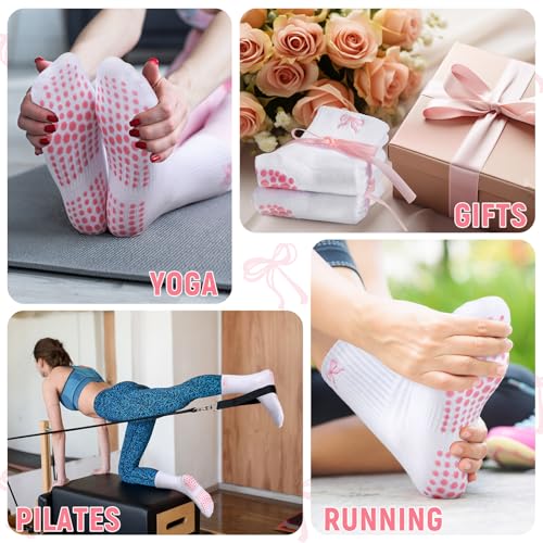 Jeyiour 5 Pairs Coquette Bow Socks for Women Pure Cotton Non Slip Pilate Grips Socks with Embroidered for Yoga Barre Ballet