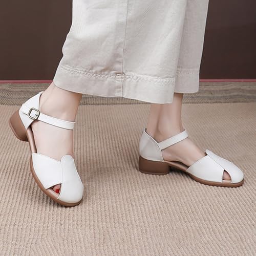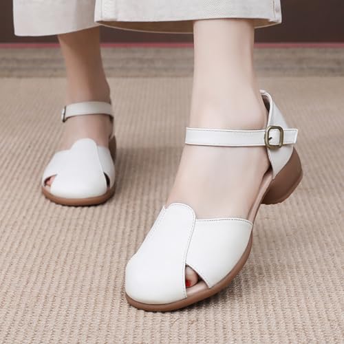 trending ! Women's Leather Closed Toe Low Block Heel Sandals,2025 Comfy Cutout Buckle Ankle Strap Casual Dressy Mary Jane Pumps