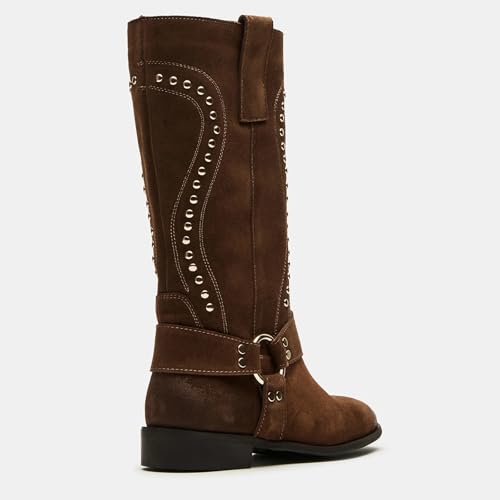 trending ! Women's Suede Knee High Riding Boots Studded Western Boots Round Toe Motorcycle Boots Wide Calf Pull on Biker Boots