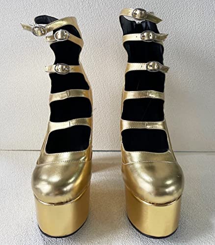 More information about Frankie Hsu Gold Lolita Women's Big Large Size Performer Cosplay Club Dancing Buckle Strap Plain Platform Chunky Block High Ankle Heeled Sandal Boots Bootie Shoes