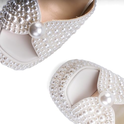 More information about White Pearl Platform Heels For Women Chunky Heeled Sandals Square Peeped Toe Ankle Strap High Heels Slingback Dress Evening Bride Bridal Shoes