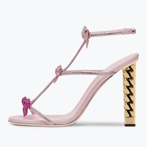 FSJ Women Gold Metal Chain Thick High Heel Sandals Open Toe Strappy Ankle Buckle Strap Slingback Comfy Summer Dress Pumps Crystal Bows Size 4-15 US