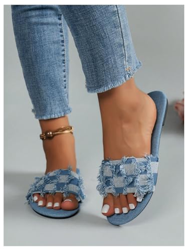 trending ! OYOANGLE Women's Plaid Denim Flat Sandals Vintage Raw Trim Open Toe Non Slip Jean Slide Sandals