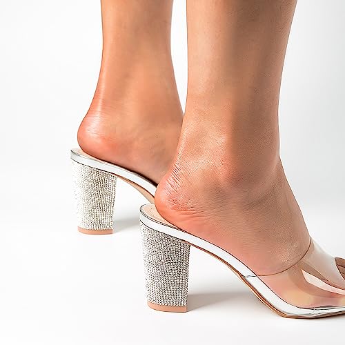 More information about Women's Square Toe Rhinestone Heeled Sandals - Clear Chunky Slipper Mules Backless Slip on for Parties Weddings Nightclub