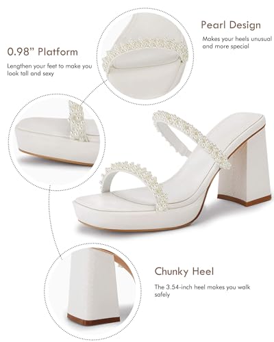 Coutgo Women's Pearl Sandals Platform Chunky High Heels Square Open Toe Strappy Slip On Slides
