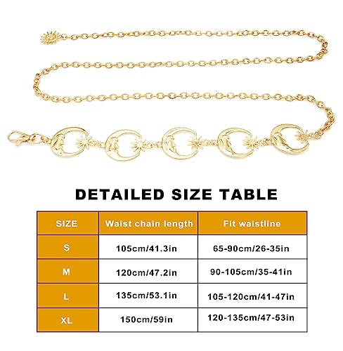 Care instructions: Dry Cloth CleanMaterial: The metal sun waist chain is made of high-quality materials with a highly polished smooth surface, which gives it a stunning appearance. The right weight ensures that it is comfortable to wear without feeling too heavySize: The waist chain is available in four different lengths for women, and it is adjustable to fit different waist sizes. The lobster clasp closure makes it easy to put on and take offDesign: The waist chain features a rare moon star shape and a cool sun pendant, making it more exotic and elegant than other belts. The special moon star chain design adds radiance to your outfit, making you stand out in the crowdMatching: The waist chain is versatile and can be paired with any outfit, including dresses, skirts, jeans, T-shirts, hoodies, jackets, casual wear, and uniforms. The unique hollow circles chain design adds a touch of glamour to your lookOccasions: The waist chain is suitable for various occasions, including daily wear, parties, dinner parties, beach parties, dates, and other casual events. It also makes an excellent gift for your mother and female friends. With its unique design and high-quality materials, the metal sun waist chain is a must-have accessory for any fashion-forward woman Perfect for everyday use. superior materials and excellent craftsmanship ensure long-lasting durability.