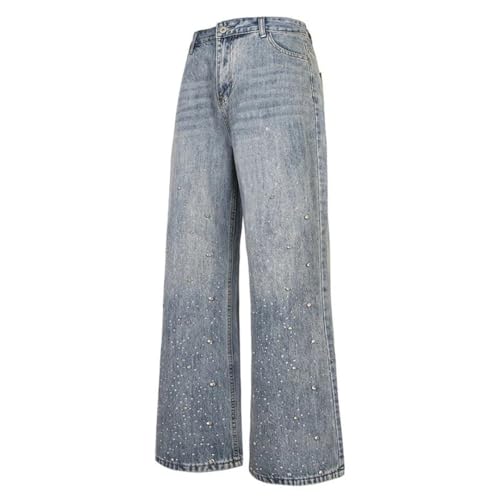 trending ! Men Rhinestone Jeans Baggy Straight Vintage Blue Denim Pants Oversized Streetwear Jeans