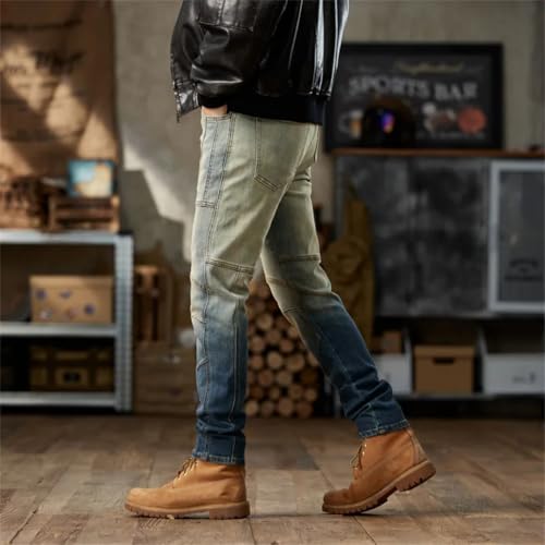 trending ! Men's Retro Fashion Motorcycle Jeans Fashionable Stitching Multi-Pocket Fashion Slim Jeans