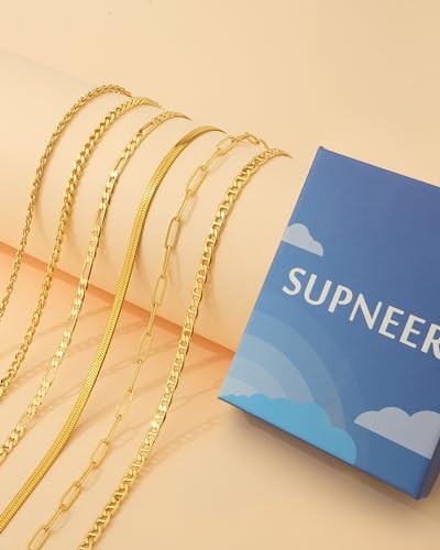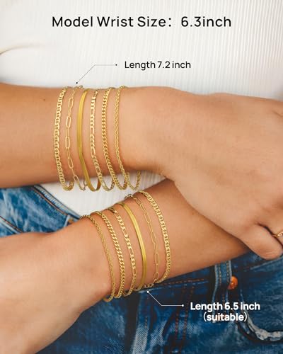 Material: 18k gold platedMetal type: Yellow GoldClasp type: Lobster ClawChain type: Cuban Chain, Link ChainGem type: No gemstoneItem type name: Bracelets6 Dainty Separate Gold Bracelets:Stackable bracelets set for women consisits of 6 exquisite thin bracelets:①Cuban chain bracelet ②Figaro bracelet ③Paper clip bracelets ④Snake chain bracelets ⑤Rope bracelets ⑥Mariner bracelet.Adorn your wrists with sparkling, each bracelet can be worn individually or layered with other chains to creating a rare personal charm !Hypoallergenic & Non-tarnish, Sensitive skin-friendly:All our gold bracelets are crafted from high-quality, safe materials,with 18k gold plated, ensuring durability and resistance to tarnishing. They are lead-free, nickel-free, and hypoallergenic, making them suitable for sensitive skin. Perfect jewelry grandmothers, mothers, daughters, and friendsSmooth Delicate Touch & Adjustable Size: These gold link bracelets crafted with precision and attention to detail,Features a smooth and delicate surface, making it resistant to skin irritation or snagging on clothing.The length of each gold bracelet is 6''/6.8''/7.2'' + adjustable extend chain,easily to adjust the length by yourself.A Fantastic Jewelry Option:The cute simple gold bracelet set is an ideal bracelets for families members (daughters, yourself,grandmothers, mothers etc.) and friends during the holiday season. It almost suits all outfit styles and occasions, including Valentine's Day, weddings, Christmas, Mother's Day, parties, engagements, classrooms, dates, beach outings, family gatherings, office settings, and everyday wear.Supneer 90 Days Guarantee:Offer a 90-day warranty on our bracelets to ensure your complete satisfaction. If you encounter any issue or are unsatisfied with your purchase, please feel free to contact us. We will offer you a FREE replacement. Warning: Not for users under 3 years old. Only for users aged 3+ years old. Perfect for everyday use. premium materials and excellent craftsmanship ensure long-lasting durability.