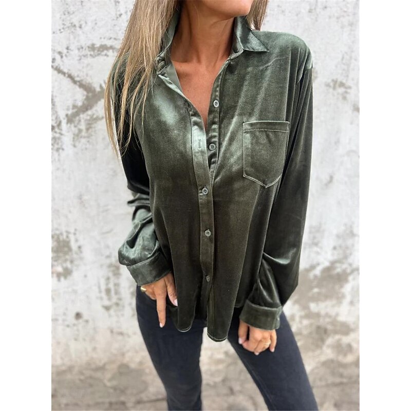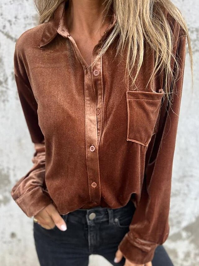 Highlights [Fabric] : Crafted from luxurious velvet, this women’s blouse provides a soft and slightly shimmering finish that enhances its elegance. The material features micro-elasticity, offering both comfort and ease of movement for daily wear during the fall and winter seasons. [Fit] : Designed with a relaxed fit, this blouse ensures snug wear without compromising on style. It falls to a regular length, making it an easy addition to any wardrobe, whether worn on its own or layered. [Design Highlights] : The blouse features a iconic button-down design with a shirt collar, complemented by a single chest pocket that adds a casual yet sophisticated touch. Its solid brown color brings warmth and depth, a versatile choice for any occasion. [Occasions] : Perfect for daily wear, this blouse is suitable for both casual and slightly formal occasions. Whether you’re headed to a business casual event or enjoying a day out, it adapts seamlessly to various settings while adding a touch of elegance. [Size Range] : Available in a variety of sizes including S, M, L, XL, and 2XL, ensuring a perfect fit for a wide range of body types.