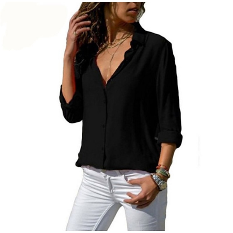 More information about Women's Shirt Blouse Black White Blue Plain Long Sleeve Work Casual Shirt Collar S