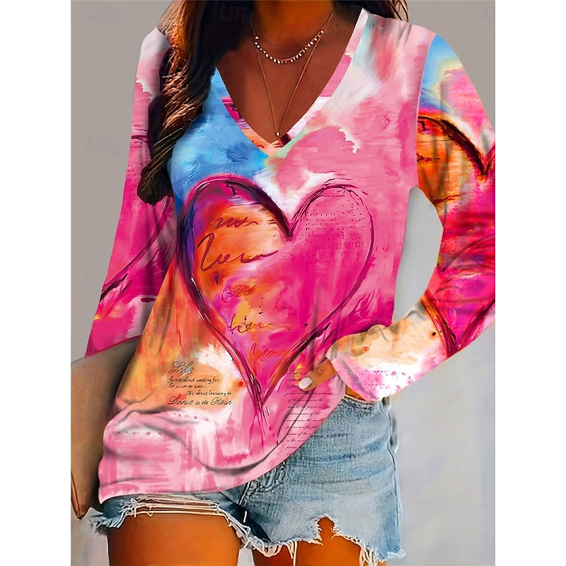 Highlights [Fabric and Design] : Crafted from high-quality polyester, this womenβs long-sleeve T-shirt features a vibrant and artistic print. The standout design includes a large heart with an abstract watercolor effect, blending shades of blue, yellow, pink, and orange for a lively and eye-catching appearance. The flattering V-neckline enhances its casual yet chic style, while the micro-elastic fabric offers comfort and ease of movement. [Fit and Style] : With a loose and regular fit, this T-shirt is designed for comfort and breathability, making it ideal for relaxed, everyday wear. The long sleeves add versatility, making it perfect for both spring and fall seasons. [Design Highlights] : The rare heart and color gradient pattern, paired with a V-neck design, gives this T-shirt a bold fashion-forward look. The print maintains its vibrancy wash after wash, ensuring long-lasting style. [Occasions] : Ideal for daily casual wear, this T-shirt can be easily dressed up or down for various occasions, from a simple day out to a casual evening gathering. [Size Range] : Available in sizes S, M, L, XL, and 2XL, this T-shirt offers a range of options to suit different body types, providing an excellent fit for everyone looking to make a style statement. Perfect for everyday use. premium materials and excellent craftsmanship ensure long-lasting durability.