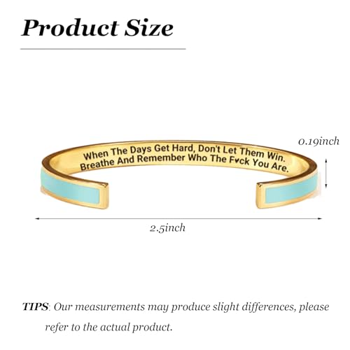 Material: AlloyMetal type: MetalGem type: No gemstoneDont Let the Hard Days Win Bracelet:You will receive an engraved bracelet, engraved with a delicate motivational message, a bracelet that inspires us to move forward.Inspirational Gifts for Women: Engraved with inspirational phrases such as βDont Let the Hard Days Winβ, this bracelet reminds the wearer to maintain a positive outlook on life, making it a spiritual accessory to inspire oneself.Don't Let The Hard Days Win Cuff Bangles: The bracelet comes with an inspirational card, making it a heart-warming gift for students who are about to take exams, friends who are starting their own business, or those who need encouragement, conveying courage and blessings.Inspirational Bracelets for Women:This inspirational bracelet is well made and of excellent, the exquisite workmanship and high quality of the materials used make the product rare in its own charm and style, coupled with the product's own gift attributes to make the product in the characteristics of the sublimation.SERVICE:If you are interested in bracelets or have any questions, please feel free to contact us and we will solve your problem within 24 hours Perfect for everyday use. High quality materials and excellent craftsmanship ensure long-lasting durability.