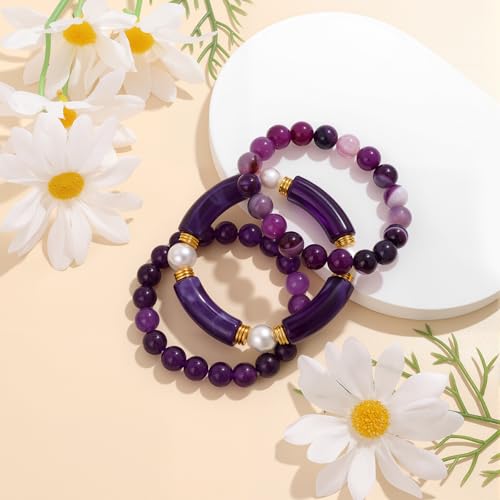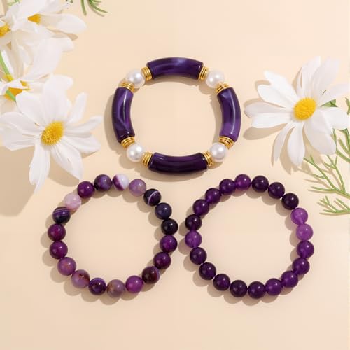 • Bracelet Meaning: Elevate your style with our exquisite three-piece bracelet set, featuring a stunning combination of amethyst bracelet and Purple striped crystal bracelet along with a vibrant purple acrylic bangle. Each piece is thoughtfully designed to complement one another, creating a harmonious blend that reflects elegance and individuality.