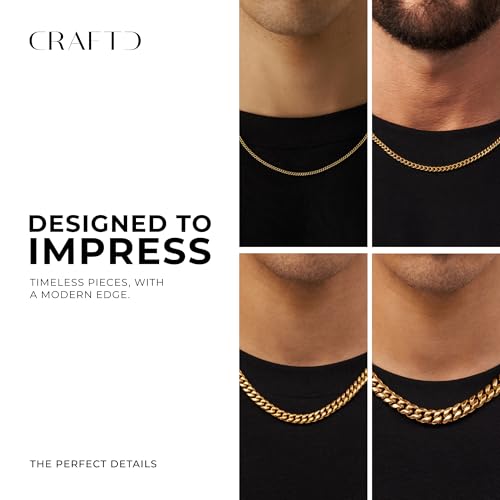 Material: 18k Gold PlateMetal type: Stainless SteelChain type: CubanGem type: No GemstoneCRAFTED FOR A LIFETIME: Expertly forged from premium 316L stainless steel and finished with a rich layer of real 18K gold, our jewelry is built to resist tarnishing, rusting, and fading - ensuring brilliance that endures.DESIGNED FOR EVERY MOMENT: Water, heat, and sweat-proof, every piece is made to move with you - whether you're in the gym, shower, or on the go - without ever losing its flawless sheen.LUXURY MEETS COMFORT: Hypoallergenic and irritation-free, our jewelry is designed for all skin types, offering an impeccable balance of style, comfort, and enduring wearability.EXTREME DURABILITY: Engineered for resilience, our jewelry withstands the most demanding conditions without compromise. Whether in gold, silver, or rhodium finish, each CRAFTD chain, bracelet, and pendant is built to endure - ready to move with you through every challenge and adventure.GLOBAL LUXURY BRAND: CRAFTD to last. We aim to fill the gap between quality jewelry and unnecessary markups across the industry. We put design at our core and focus on cutting through the noisy, low quality space that fast-fashion has brought. faultless for everyday use. premium materials and excellent craftsmanship ensure long-lasting durability.
