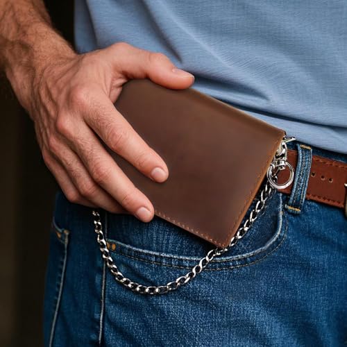 Brand: boshihoColor: Plain Leather BlackMaterial: LeatherStyle: Chain Wallet for Bikers MenPattern: SolidAuthentic Crazy Horse Leather: Crafted from thick full-grain Crazy Horse leather, naturally scratch-resistant and develops rugged patina over timeLarge Capacity & Organization: Store 13 cards + folded bills effortlessly with dedicated slots. Two full-size cash and coin compartments hold 15+ bills each, while remaining slim at 4.5x3.34RFID Protection: Copper-lined RFID blocking shields 13.56MHz scanners. Hidden inner pocket for emergency cash. RFID shield blocks skimmersAnti-Theft Chain Security: 19-inch zinc-alloy chain attach to belt loops, motorcycle handles, or backpacks. Includes FREE key ring – holds keys/AirTagPerfect Gift: Suitable for both road cycling and equestrian sports, this wallet makes an ideal present for Father’s Day, Valentine’s Day, Christmas, Thanksgiving, anniversaries, etc. faultless for gifting to friends, husbands, boyfriends, cycling enthusiasts, drivers, and more Perfect for everyday use. premium materials and excellent craftsmanship ensure long-lasting durability.