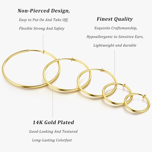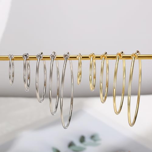 Material: MetalMetal type: Stainless SteelBack Finding: Clip OnEarring design: HoopCLIP ON HOOP EARRINGS: One order you can get ten pairs clip on earrings, enough quantity for you to wear; These clip on hoop earrings are virtually indistinguishable from pierced hoops, specially designed for those without pierced ears who still want to add charm to their look; Elevate your style effortlessly with our Invisible Clip-on HoopsMULTIPLE SIZE: Clip on earrings hoops have two colors(silver/gold), size include small clip on hoop earrings 25mm (0.6 inch), medium fake hoop earrings 30mm (1.2 inch), large spring hoop earrings 40mm (1.5 inch), XL clip hoop earrings 50mm (1.9 inch), XXL non-pierced earrings 60mm (2.3 inch); Find the perfect fit for any occasionHYPOALLERGENIC MATERIAL: These clip on hoop earrings for women are crafted from 316L stainless steel post and copper, nickel-free and lead-free, waterproof and rust-resistant, will not irritate your ears, plush to wear; These clip on earrings hoop are exceptionally lightweight, ensuring they won't burden your earsNON-PIERCING EARRINGS: The springs of our clip on earrings are specially wound to be both comfortable to wear and also to stay in place without falling off; In addition, We've addressed the common discomfort associated with ear clips, and equipped with elastic rubber plug, just clamp the ear to adjust the appropriate position, will not pierce your earsIDEAL GIFT CHOICE: Don't have pierced ears but still want to look fabulous? No problem! These fashion fake hoop earrings are a favorite among women, a meaningful gift for mom, wife, best friend or yourself on Christmas, Birthday, Wedding, Anniversary, Mother’s Day, Valentines Day, etcSATISFACTORY SERVICE: We Promise to Provide the superior Products and the Perfect Service to Our Customers; Ninety Days Money Back and Exchange Service, Our Professional After-sales Team is Online Twenty-four Hours a Day; We Strictly Inspect Our Products for Men’s Handsome and Women’s Beauty; and if Any Needs, Please Feel Free Contact Us, Thank You Perfect for everyday use. High quality materials and excellent craftsmanship ensure long-lasting durability.