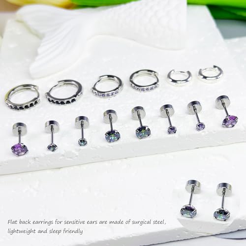 Surgical Stainless Steel Earrings for Sensitive Ears Flat Back Stud Earrings Hoop Earrings Set for Women Hypoallergenic Cubic Zirconia Earrings Tiny CZ Nap Studs for Cartilage