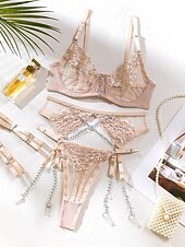 Highlights [Product Title] : Women's Sexy Lingerie Sets Pure Color Lovers Hot Christmas Polyester Breathable Straps Sleeveless Backless Summer Spring Home Outfits [Fabric] : Crafted from a high-quality polyester blend, this lingerie set offers breathability and a luxurious feel against the skin. The material ensures comfort and ease of wear, making it suitable for intimate occasions. [Silhouette] : Designed to highlight the body's natural curves, this set includes a sheer, mesh fabric that shapes and supports. The underwired bra provides a flattering shape, while the garter belt adds elegance and allure to the ensemble. [Design Highlights] : This set features intricate red floral embroidery on the bra and garter belt, complemented by modern silver chain accents for an edgy twist. The backless design with adjustable elasticized straps offers a perfect fit and added functionality. The delicate detailing on the panties, including semi-sheer panels, completes the cohesive and sophisticated look. [Occasions] : Ideal for Christmas celebrations, romantic evenings, and any special occasion where you wish to make a memorable impression. This lingerie set is designed to add a touch of glamour and seduction to your intimate wardrobe. [Size Range] : Available in sizes S, M, L, and XL, this set provides options to ensure the perfect fit for a wide range of body types. Perfect for everyday use. excellent materials and excellent craftsmanship ensure long-lasting durability.