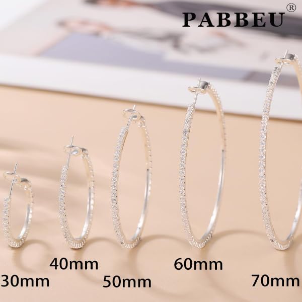 PABBEU 2mm 925 Sterling Silver Earrings Big Sterling Silver Hoop Earrings for Women Large Rhinestone Hoop Earrings Thin Hypoallergenic Cubic Zirconia Earrings for Women 30/40/50/60/70mm