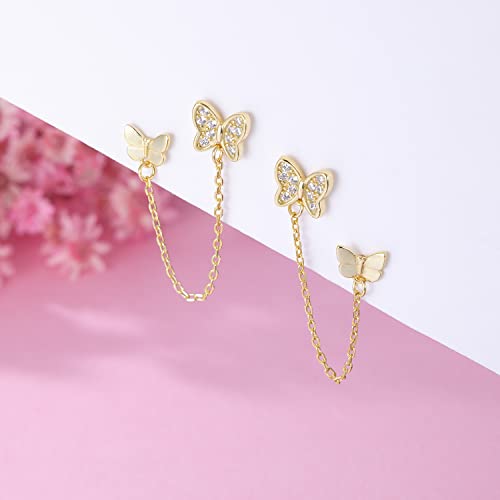trending ! Reffeer Solid 925 Sterling Silver Double Holes CZ Butterfly Chain Stud Earrings Two Butterfly Cuff Climber Earrings for Women Teen