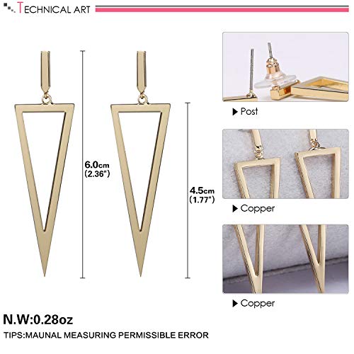 Item display length: 3.74 inchesMaterial: CopperMetal type: CopperBack Finding: Lever Back, Screw BackEarring design: DropUnique Design:Women Geometric Triangle Shape Drop Earrings ,make you charmer and elegant, charming and attractive.Materials:This statement earings is made in Copper. Dimention:2 3/8 in Length.Environmentally friendly material, Lead-Free & Nickle-Free & Cadmium-free, passed SGS Inspection Standard, no harm to health.Package:A free gift box coming with the Jewelry. No wrapping needed. Perfect gift for Anniversary Day, Valentines Day and Birthday to your girlfriend, wife and Mother's Day gift for mom.30 days 100% Satisfaction Guarantee. Please Check Size refrences images and guide before ordering. Contact us with any problems or questions. We value customer satisfaction above all else. Perfect for everyday use. superior materials and excellent craftsmanship ensure long-lasting durability.