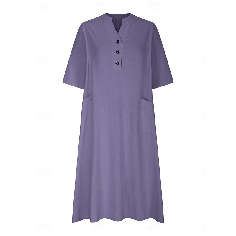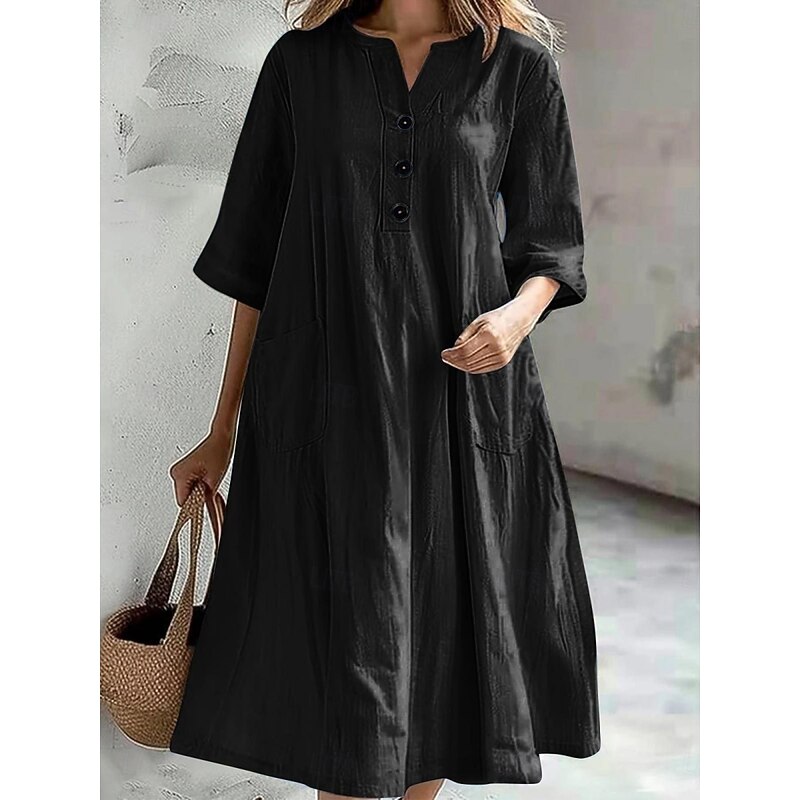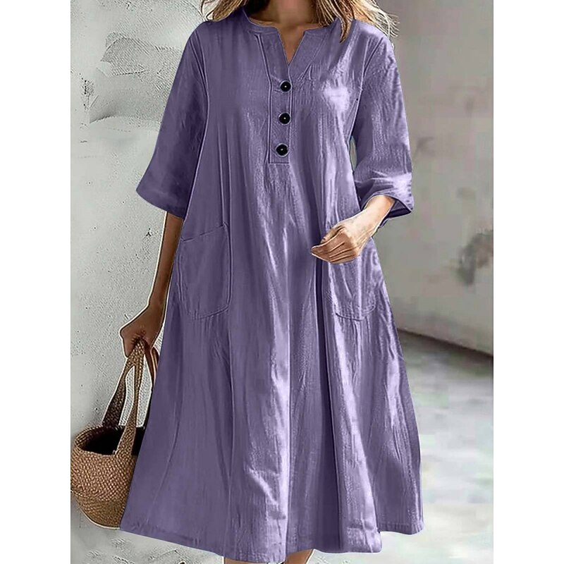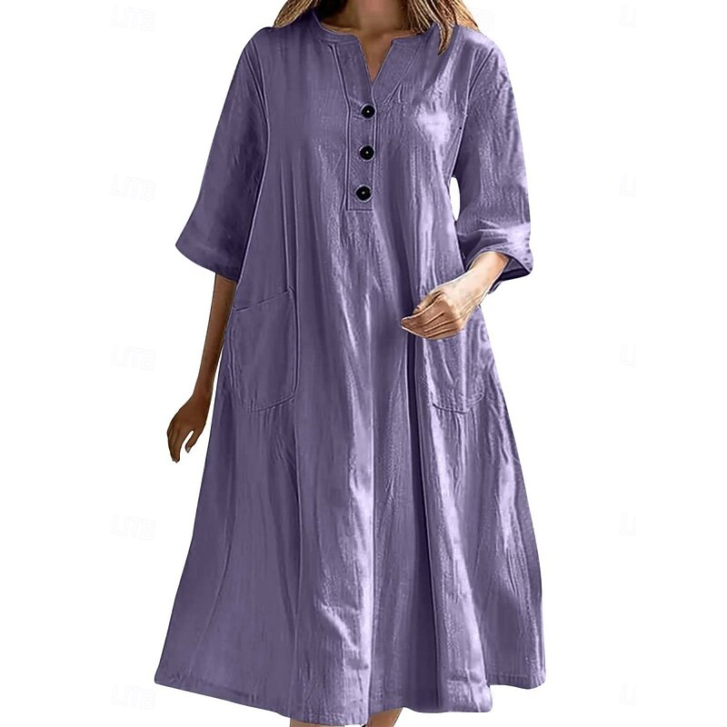 trending ! Women's Midi Dress Cotton Linen Dresses Basic Casual Vacation Daily Regular Fit Plain 3/4 Length Sleeve Notched Neck Black Red Purple Light Blue Summer