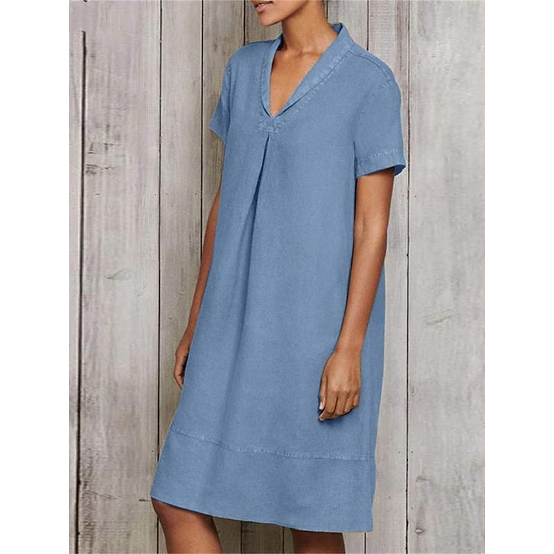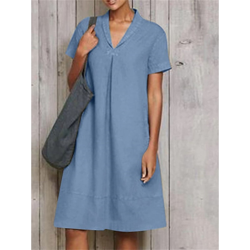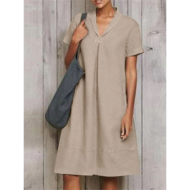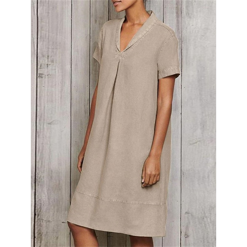 Highlights [Fabric] : Crafted from a high-quality cotton and linen blend, this dress offers a breathable and lightweight feel, making it perfect for spring and summer. The soft, natural fibers ensure comfort and a relaxed fit, with micro-elasticity for added flexibility. [Style] : This loose-fit A-line dress features a versatile midi length, making it suitable for a wide range of body types. The classic V-neckline and short sleeves contribute to its chic, casual style, emphasizing effortless fashion. [Design Highlights] : The dress showcases subtle ruching details, adding a touch of sophistication and modern flair to the otherwise plain design. This thoughtful detail elevates the dressβs simplicity, making it a versatile piece for various occasions. [Occasions] : Ideal for daily wear, vacations, or outdoor activities, this dress seamlessly transitions from casual outings to relaxed gatherings. Its simple elegance ensures it is an excellent choice for a variety of settings, offering both comfort and style. [Size Range] : Available in sizes S, M, L, XL, and 2XL, this dress caters to a broad range of figures, ensuring everyone can enjoy its sophisticated design and comfortable fit. Perfect for everyday use. premium materials and excellent craftsmanship ensure long-lasting durability.