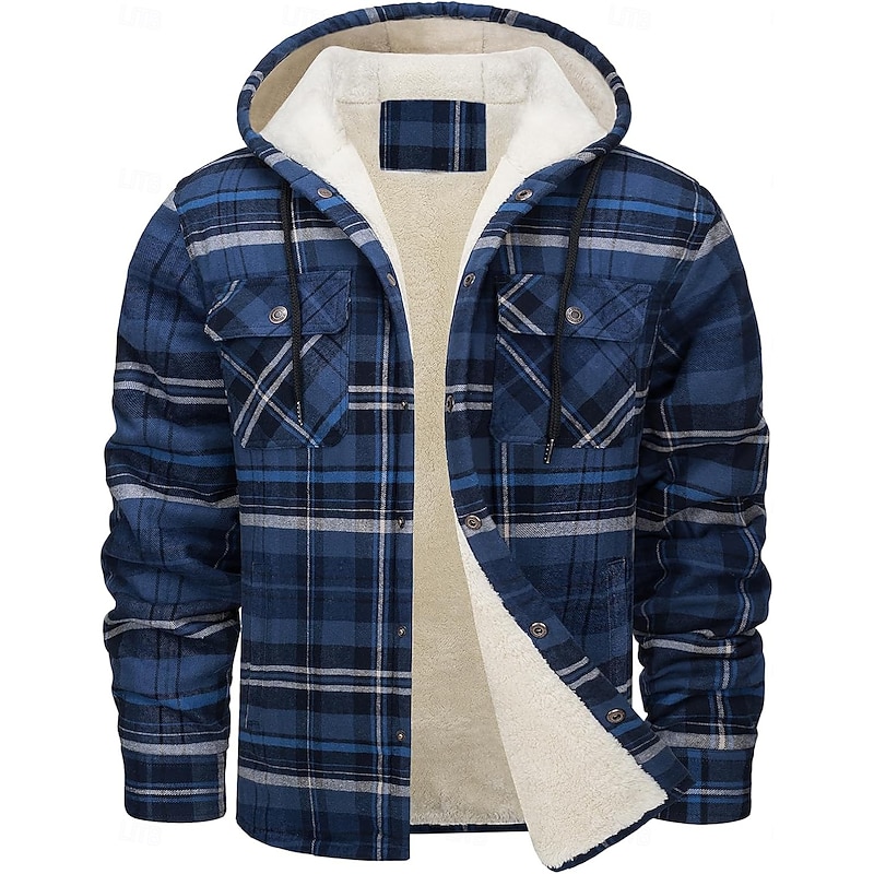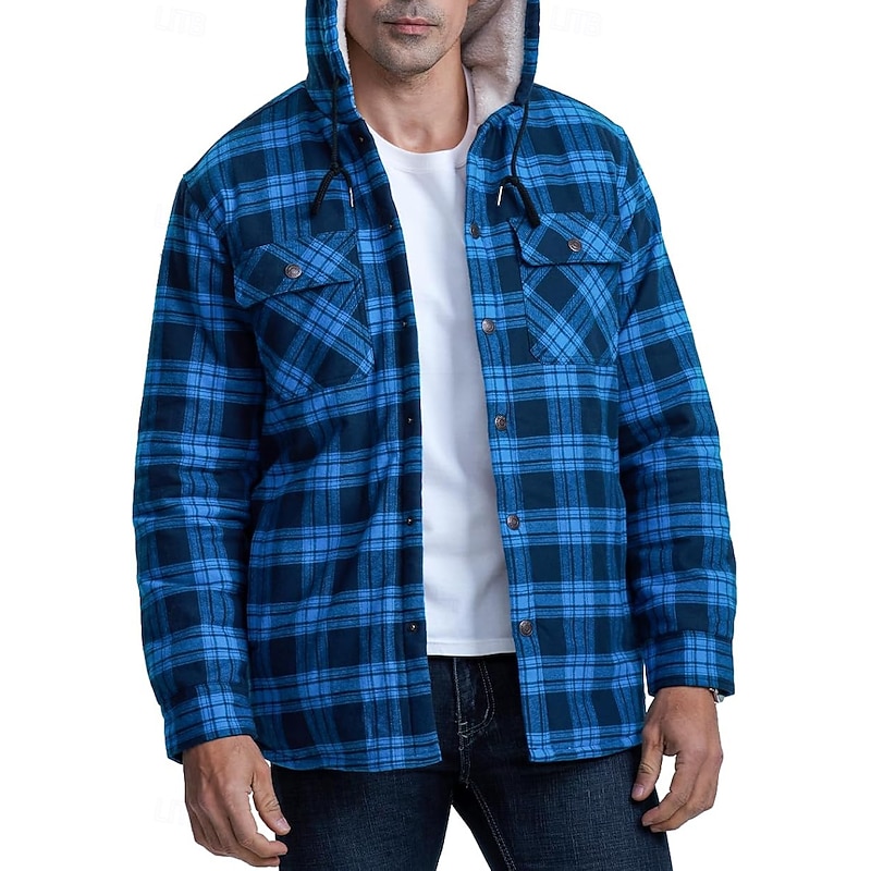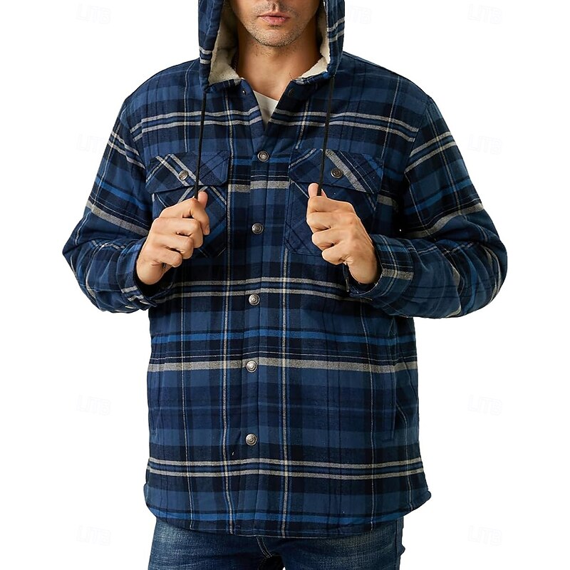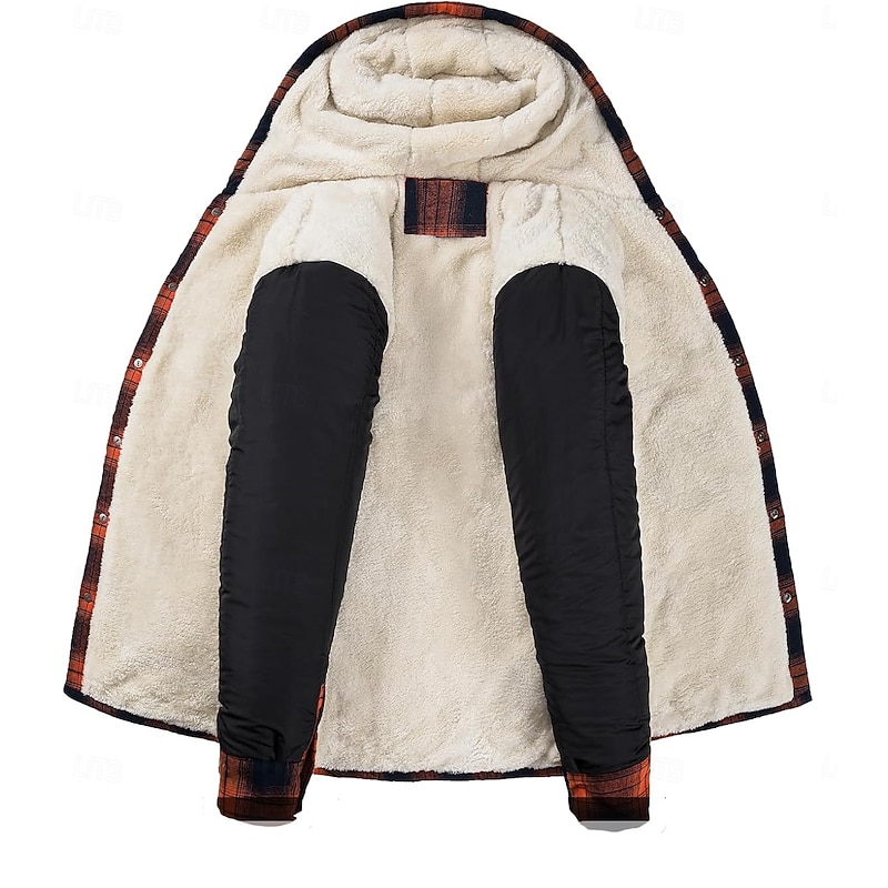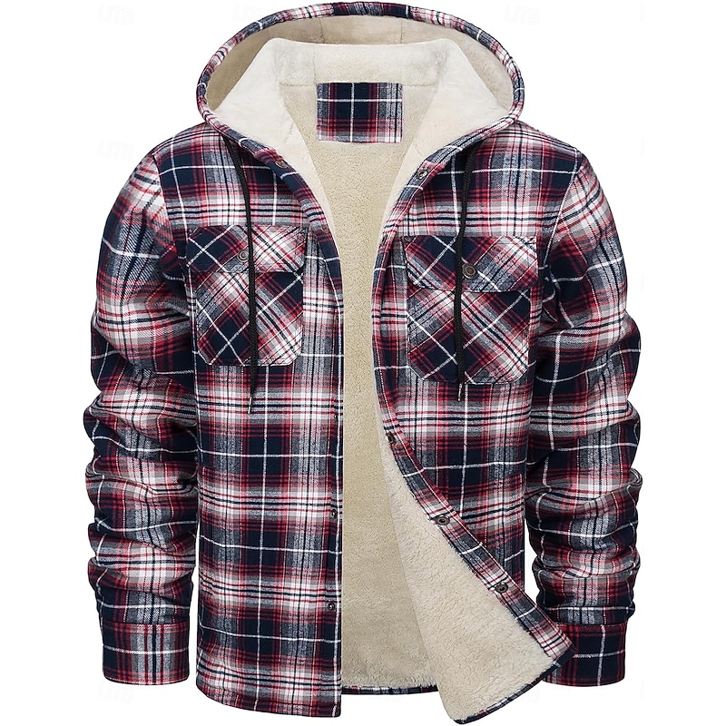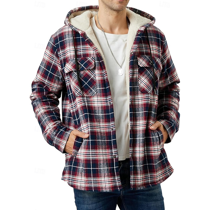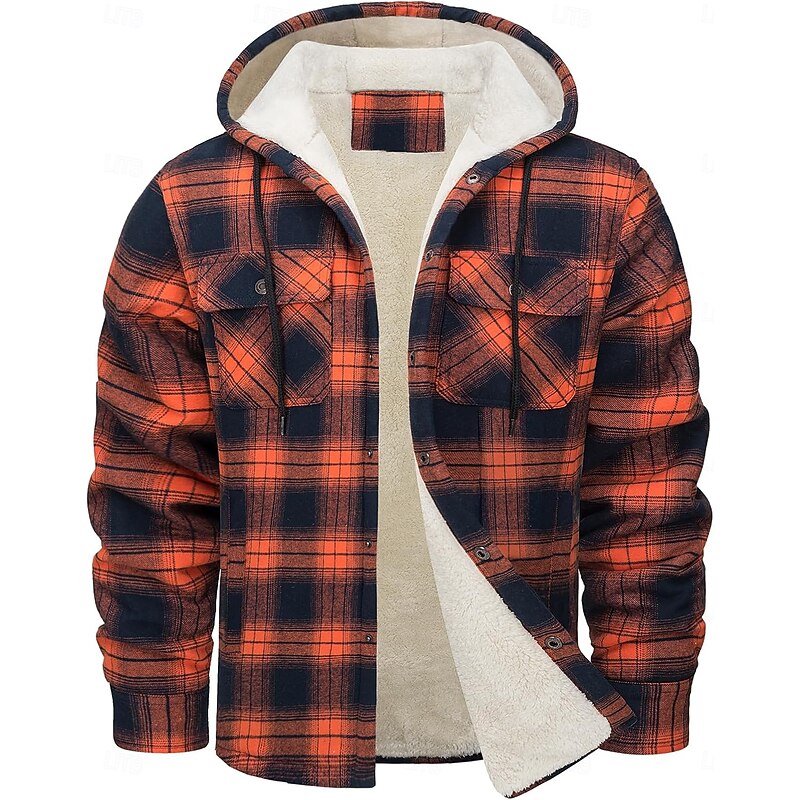 More information about Men's Shirt Jacket Hoodied Jacket Shacket Flannel Fleece Jacket Outdoor Daily Wear snug Pocket Hooded Fall Winter Plaid Checkered Fashion Streetwear Lapel Regular Black Red Navy Blue Royal Blue Orange