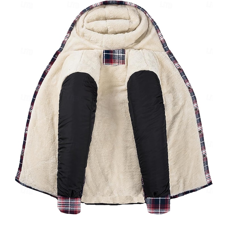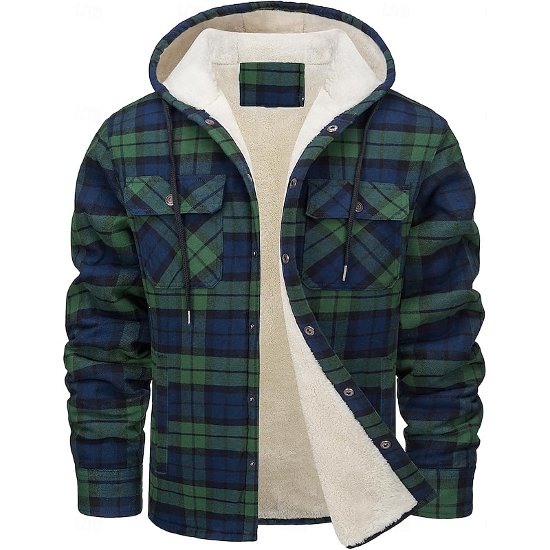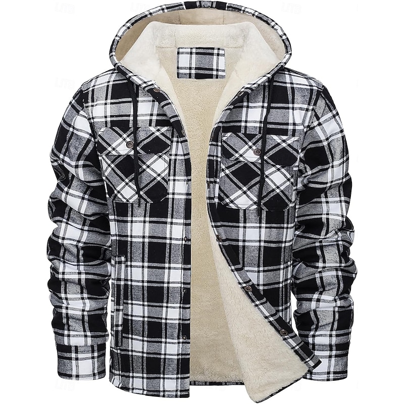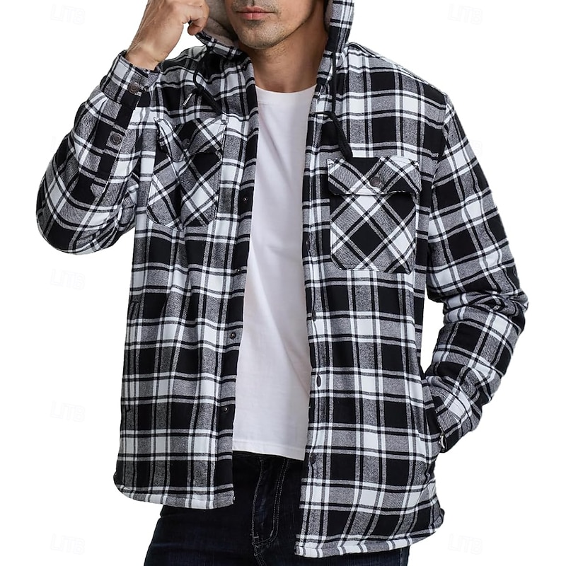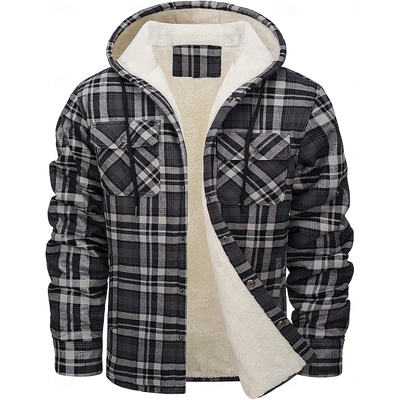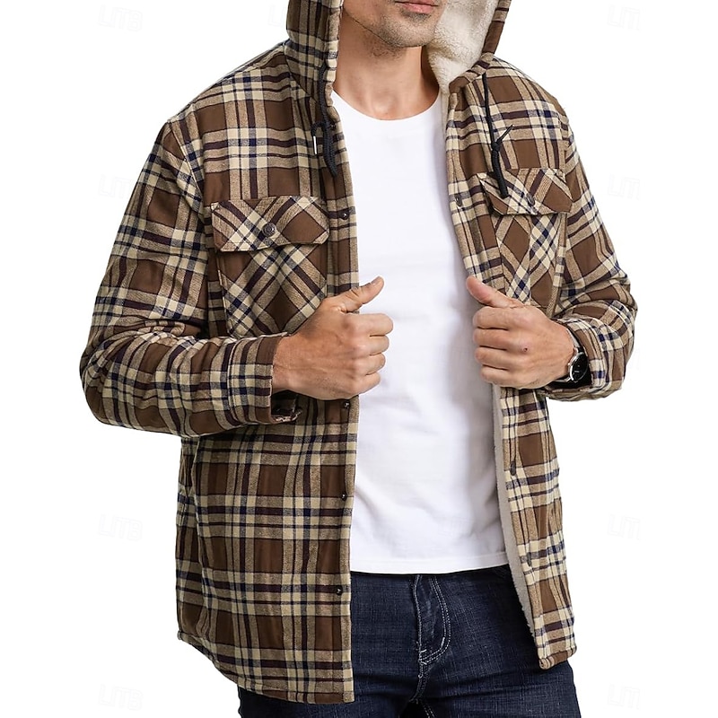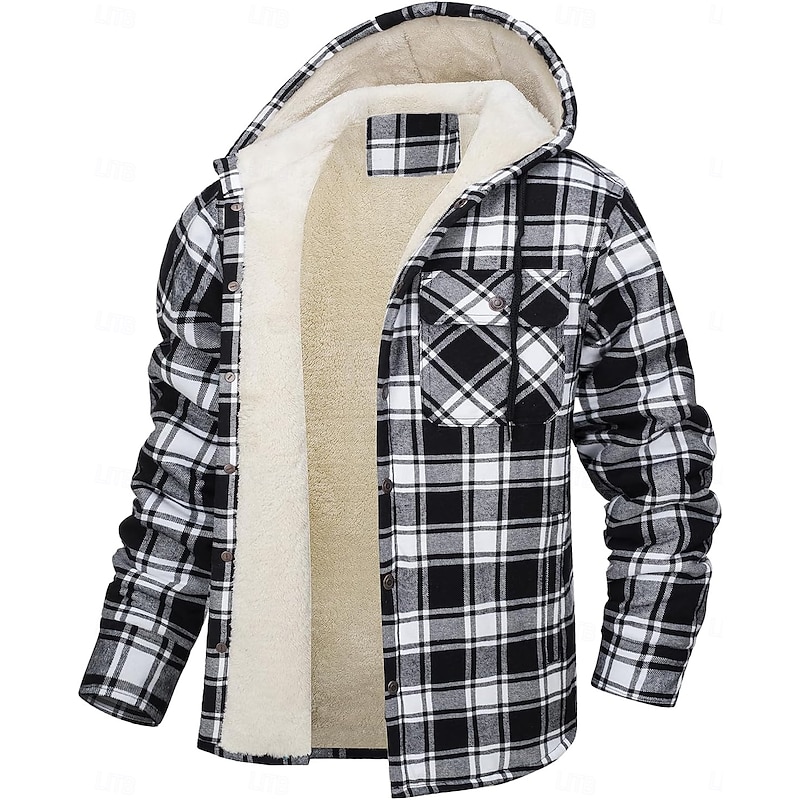 More information about Men's Shirt Jacket Hoodied Jacket Shacket Flannel Fleece Jacket Outdoor Daily Wear snug Pocket Hooded Fall Winter Plaid Checkered Fashion Streetwear Lapel Regular Black Red Navy Blue Royal Blue Orange