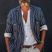 Men's Lightweight Jacket Shirt Jacket Casual Jacket Shacket Daily Vacation Breathable Pocket Spring & Fall Striped Fashion traditional Lapel Regular Blue Jacket