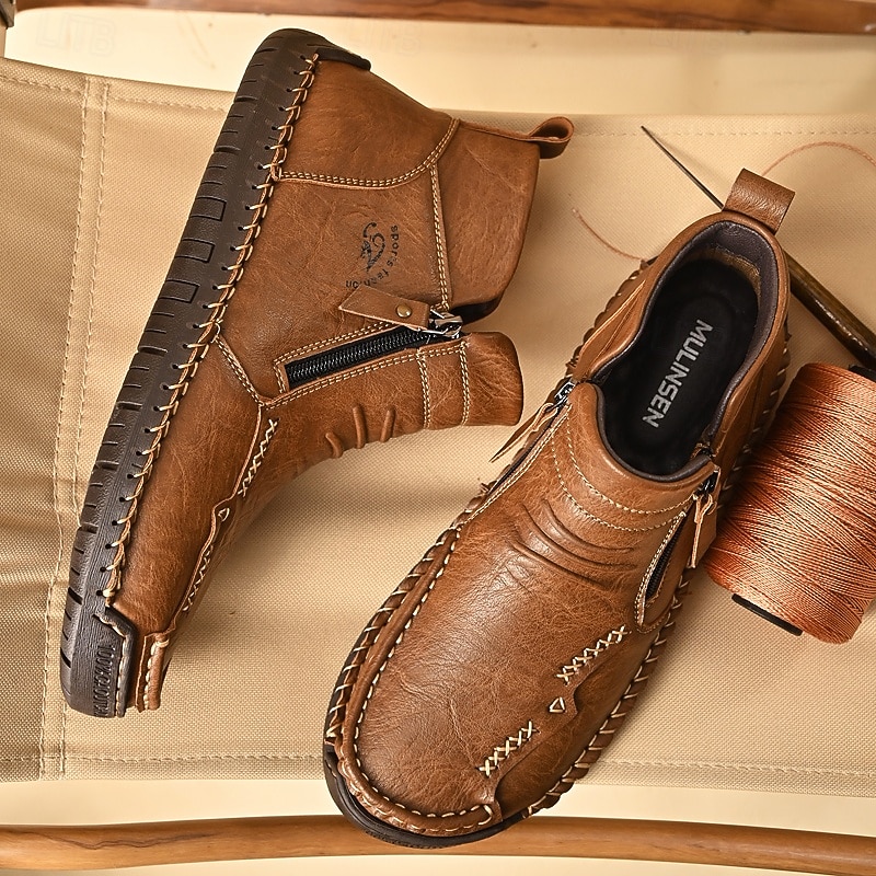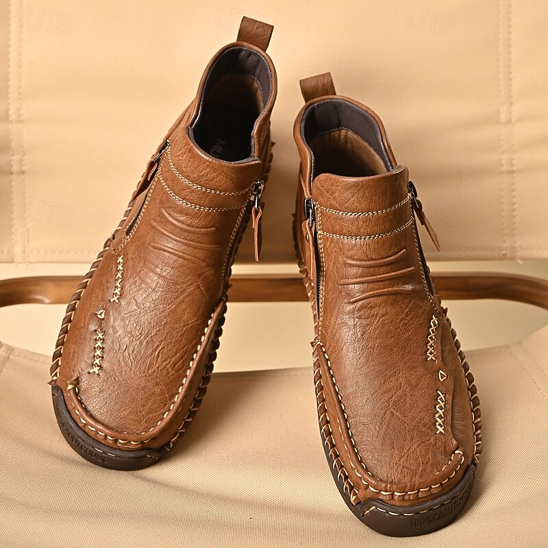 Highlights [Fabric] : Crafted from high-quality microfiber and lined with PU, these men's ankle boots offer a blend of durability and comfort. The rich brown leather finish not only provides a classic and versatile appearance but also ensures resilience and longevity. The non-slip rubber outsole adds extra traction, making these boots perfect for various surfaces. [Fit] : Designed with a convenient side zipper closure, these boots offer a sleek, modern fit that is easy to slip on and off. The round toe shape and padded interior enhance comfort, making them suitable for prolonged wear. [Design Highlights] : Featuring intricate stitching along the seams, these boots exhibit exceptional attention to detail, enhancing both durability and aesthetic appeal. The handcrafted design emphasizes quality and stylishness, making them a premium choice for fashion-forward individuals. [Occasions] : These versatile boots are perfect for a variety of occasions, from casual outings to work settings and light outdoor activities. Whether it's a day at the office or a weekend adventure, they add a rugged yet refined touch to any ensemble. [Size Range] : Available in a variety of sizes, including US sizes 6 to 11, these boots cater to a broad range of foot sizes, ensuring a comfortable and tailored fit for every customer. Perfect for everyday use. supreme materials and excellent craftsmanship ensure long-lasting durability.