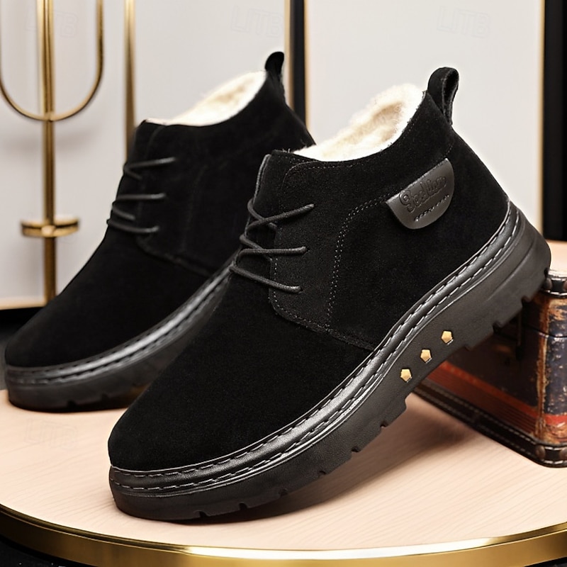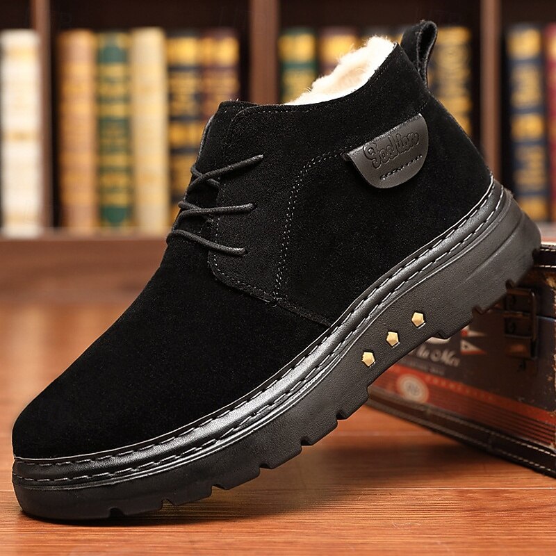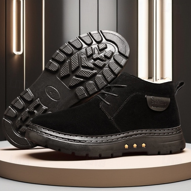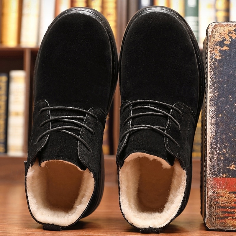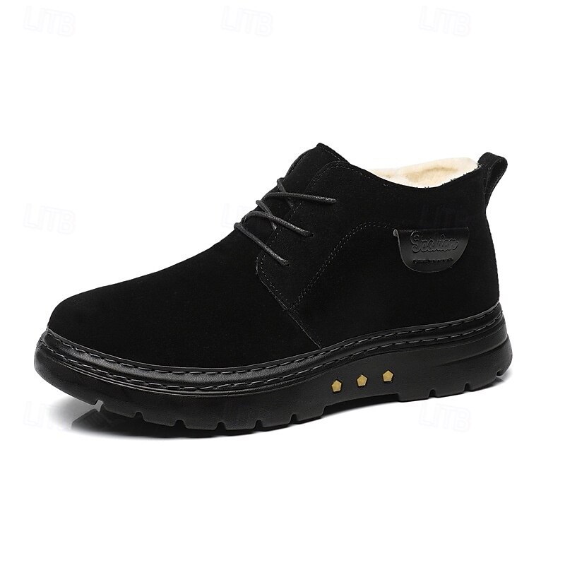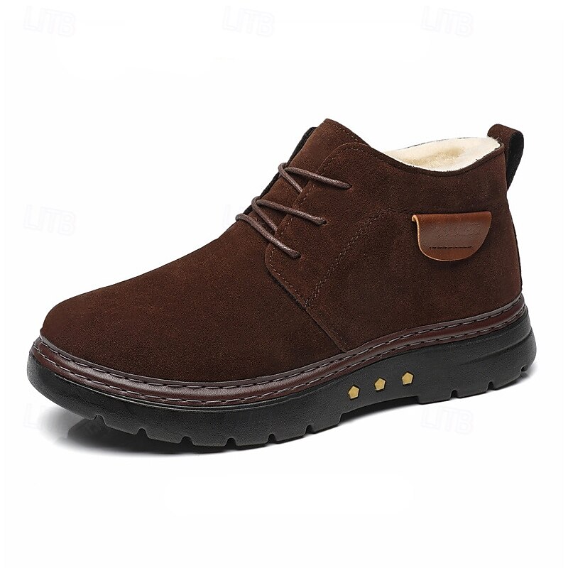 Highlights [Material] : Crafted from high-quality PU leather and fabric, these men's ankle boots boast a sophisticated look while being highly durable. The rich brown color enhances their classic appeal, making them a sophisticated addition to your winter wardrobe. [Style] : The boots feature a classic round toe and ankle-high design, equipped with strong, reinforced stitching for enhanced durability. Their timeless silhouette ensures they remain a staple for years to come, easily pairing with various outfits. [Design Highlights] : Featuring a cozy fleece lining, these boots keep your feet warm and snug in colder climates. The non-slip rubber outsole provides excellent traction on various surfaces, ensuring stability and safety during outdoor activities. The lace-up closure adds a touch of casual style while allowing for an adjustable fit. [Occasions] : Perfect for winter outdoor wear, these boots are ideal for activities ranging from casual walks to more adventurous outings. Their design ensures you stay comfortable and stylish, whether you're navigating city streets or exploring snowy trails. [Size Range] : Available in a variety of sizes, these boots cater to men's sizes US7 to US11, ensuring a perfect fit for different foot dimensions. Perfect for everyday use. premium materials and excellent craftsmanship ensure long-lasting durability.