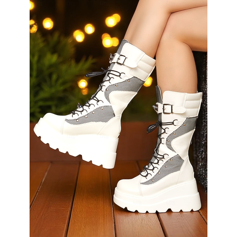 At motoshowbielsko.pl, we believe in providing our customers with only the best products. This Women's White Platform Combat Boots, Lace-Up Mesh Panel High Ankle Boots with Buckle Straps, Edgy Streetwear Style for Nightlife and Party Looks is designed with attention to detail and high quality craftsmanship that you can see and feel. Whether you're looking for functionality, style, or both, this product delivers exceptional value.