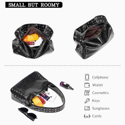Fabric type: Pu LeatherOrigin: ImportedClosure type: ZipperLining: PolyesterUnique Black Shoulder Bag: This studded purse is crafted. It features high-quality metal studs that are securely attached for a durable finishSoft Touch Material: Y2k purses for women made from high-quality crackle faux leather, this handbag has a soft, supple texture that is easy to clean and maintainAmple Capacity: The studded bag is 11 x 7.5 x 3.9 inches and offers just the right amount of space for your essentials. The interior features a main compartment, along with a zippered pocket for added security, making it easy to organize your belongings and access them quicklyVersatile Straps: With a fixed short shoulder strap and an adjustable long shoulder strap, it provides you with comfortable and sophisticated wearing options whether you like to carry it as a handbag, underarm bag, shoulder bag, or crossbody bagPerfect for Every Occasion: This studded bag is perfect for work, leisure, or shopping. The vintage design adds a touch of elegance to any outfit, making it ideal for everyday and special occasions Perfect for everyday use. premium materials and excellent craftsmanship ensure long-lasting durability.