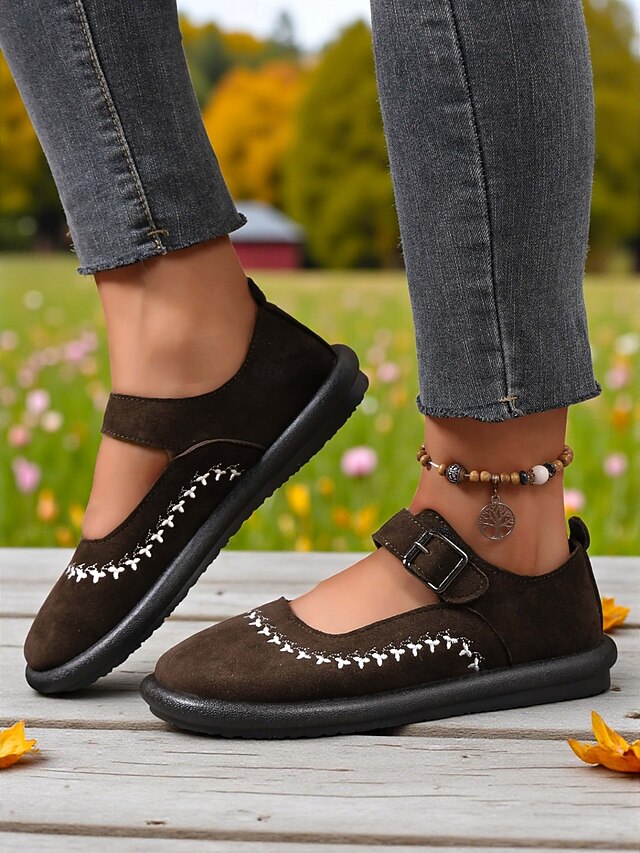 Why Choose Women's Brown Wide Fit Mary Jane Flats with Buckle Strap and Embroidered Detailing, plush Casual Faux Suede Shoes for Daily Wear and Travel?